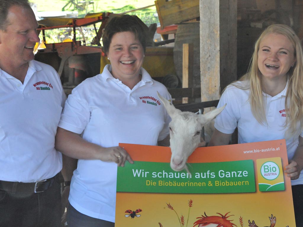 Fam. Pobaschnig aus Zeindorf bei Kappel bewirtschaftet die rund 25 ha landwirtschaftliche Nutzfläche und zusätzliche 45ha Pachtfläche nach den Grundsätzen der organisch biologischen Wirtschaftsweise und verpflichten sich damit strengen Produktionsrichtlinien. Alte Streuobstwiesen prägen das Landschaftsbild der Gegend und spielen auch am Jörgele Hof eine wichtige Rolle. Sie bieten den Milchkühen und –ziegen ausgezeichnetes Weideland und liefern darüber hinaus reiche Obsternten. Mit allen Betriebsschienen, der Bio-Wiesenmilch Produktion für die Kärntnermilch, der Bio-Ziegeneis Vermarktung und dem jüngsten Naturschutzprojekt mit „BirdLife Kärnten“ zeigen Bernd und Petra Pobaschnig nicht nur Vielseitigkeit, sondern auch innovatives Vermarktungsgeschick.